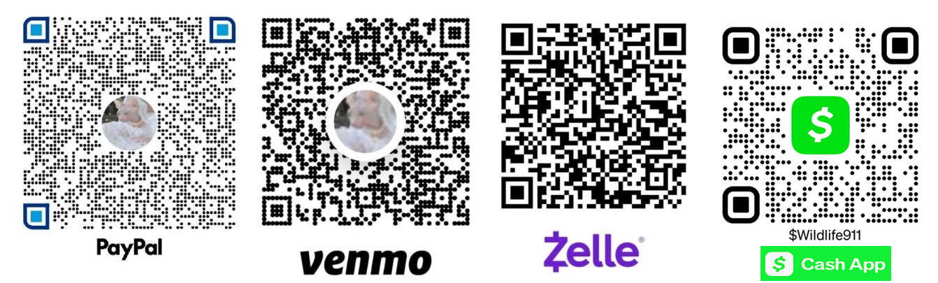 We accept PayPal, Venmo, Zelle, Cash App, cash or check. Use the QR Codes below or email us at Wildlife911nn@gmail.com, call or text (804) 453-0050