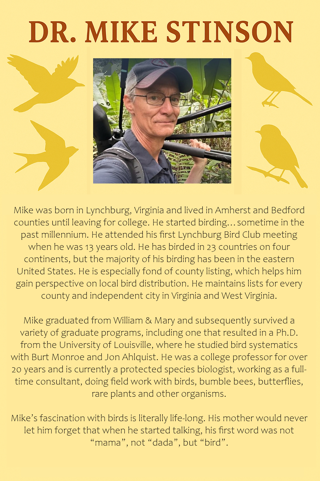 September’s meeting will have a very special guest speaker, Dr. Mike Stinson, Professional Ornithologist and International Birder.